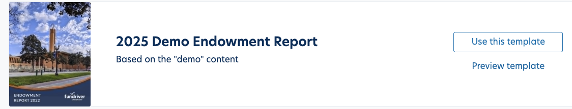 Template: A professionally designed Adobe InDesign file provided by Fundriver, into which a user's branding, content, and data is pulled. Much like a mail merge, different information flows through each report while the overall look and feel remains the same.