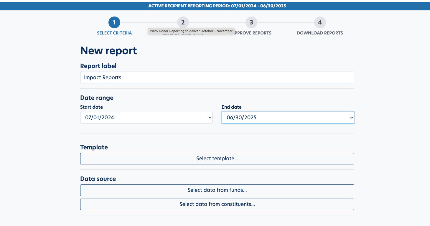 - Note: Just the financial data is selected based on the report dates. The Recipient information is based upon the "Active Recipient Reporting" period.